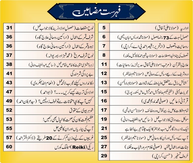 11th Issue of Volume 10. A magazine in urdu language mainly based on spiritual treatment and learning. Many topics on ISLAM, SUFISM, SOCIAL PROBLEMS, SELF HELP, PSYCHOLOGY, HEALTH, SPIRITUAL TREATMENT etc. A Very useful magazine for everyone.
