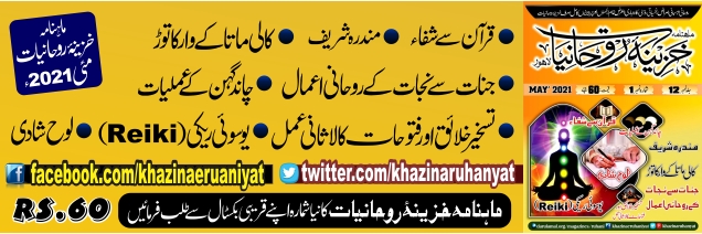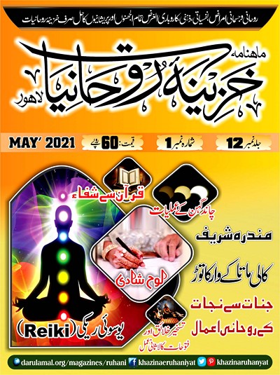 ماہنامہ خزینۂ روحانیات کی بارہویں جلد کا پہلا شمارہ مئی2021 میں شائع ہوا۔ رسالہ خریدنے کے لئے ساٹھ 60 روپے علاوہ ڈاک خرچ ادارے میں جمع کروائیں اور گھر بیٹھے رسالہ حاصل کریں۔ ادائیگی کے لئے ادائیگی کا صفحہ دیکھیں۔