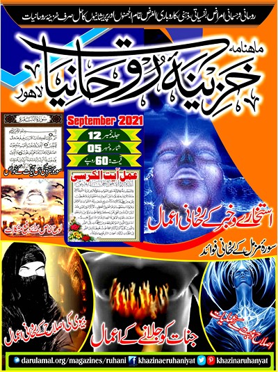ماہنامہ خزینۂ روحانیات کی بارہویں جلد کا پانچواں شمارہ ستمبر2021 میں شائع ہوا۔ رسالہ خریدنے کے لئے ساٹھ 60 روپے علاوہ ڈاک خرچ ادارے میں جمع کروائیں اور گھر بیٹھے رسالہ حاصل کریں۔ ادائیگی کے لئے ادائیگی کا صفحہ دیکھیں۔