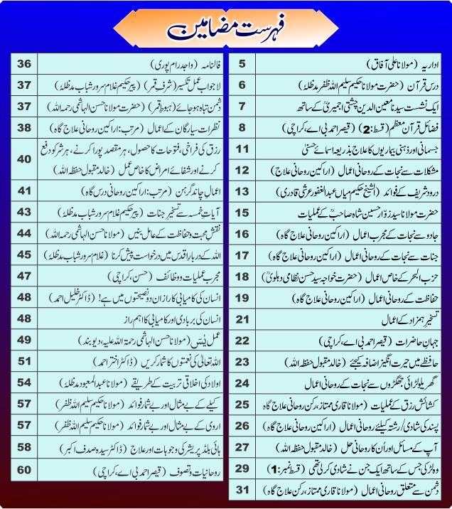 7th issue of Volume 12. A magazine in urdu language mainly based on spiritual treatment and learning. Many topics on ISLAM, SUFISM, SOCIAL PROBLEMS, SELF HELP, PSYCHOLOGY, HEALTH, SPIRITUAL TREATMENT, Ruqya etc. A very useful magazine for everyone.