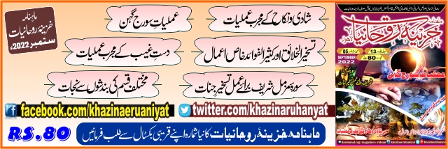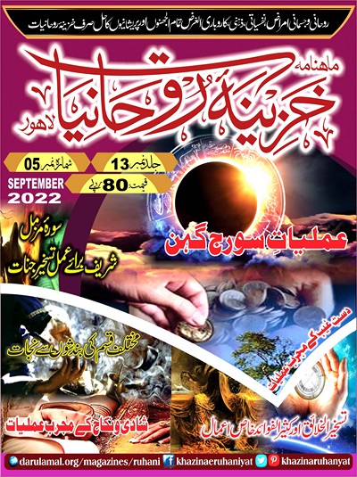 ماہنامہ خزینۂ روحانیات کی تیرہویں جلد کا پانچواں شمارہ ستمبر 2022 میں شائع ہوا۔ رسالہ خریدنے کے لئے اسی 80 روپے علاوہ ڈاک خرچ ادارے میں جمع کروائیں اور گھر بیٹھے رسالہ حاصل کریں۔ ادائیگی کے لئے ادائیگی کا صفحہ دیکھیں۔