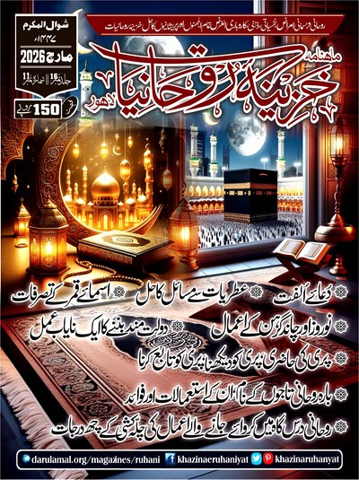 ماہنامہ خزینۂ روحانیات کی سولہویں جلد کا گیارہواں شمارہ مارچ 2026 میں شائع ہوا۔ رسالہ خریدنے کے لئے ایک سو پچاس 150 روپے علاوہ ڈاک خرچ ادارے میں جمع کروائیں اور گھر بیٹھے رسالہ حاصل کریں۔ ادائیگی کے لئے ادائیگی کا صفحہ دیکھیں۔