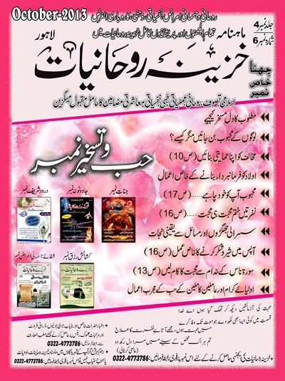 ماہنامہ خزینہ روحانیات کی چوتھی جلد کا چھٹا شمارہ اور چھٹا خاص نمبر ’’حب و تسخیر نمبر‘‘ اکتوبر2013 --- اللہ تعالی کے فضل و کرم سے شائع ہو گیا ہے۔ جیسا کہ نام سے ظاہر ہے کہ شمارہ ایسے اعمال پر مشتمل ہے جو محبت اور تسخیر کے لئے پڑھے جاتے ہیں۔