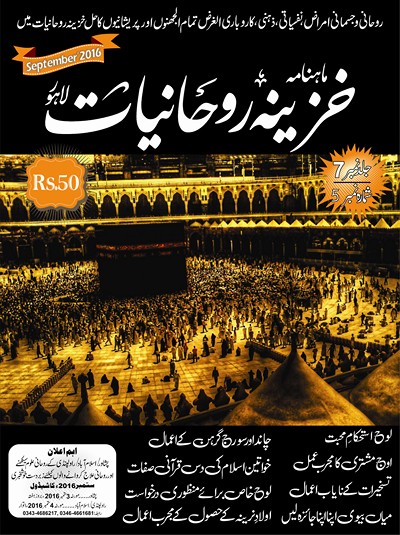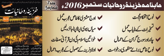 ماہنامہ خزینۂ روحانیات کی ساتویں جلد کا پانچواں شمارہ ستمبر 2016 میں شائع ہوا۔ رسالہ خریدنے کے لئے پچاس 50 روپے علاوہ ڈاک خرچ ادارے میں جمع کروائیں اور گھر بیٹھے رسالہ حاصل کریں۔ ادائیگی کے لئے ادائیگی کا صفحہ دیکھیں۔