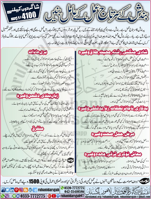بندش لگانا عملیات میں ایک خاص عمل ہے اور بہت کم عاملین اس کو صحیح طرح کرنا جانتے ہیں۔ عموماً غلط قسم کے عاملین بذریعہ جادو اور شیاطین یہ کام انجام دیتے ہیں۔ اور زیادہ تر ناجائز ہی کرتے ہیں۔ بہت سی ایسی موقع ہوتے ہیں کہاں جائز طور پر بندش لگانا ضروری ہوتا ہے یا گنجائش ہوتی ہے۔ مگر عمل نہ ہونے کے باعث لوگ انہی جادوگروں کا رخ کرتے ہیں۔ اس لئے روحانی درسگاہ کی طرف سے یہ عمل پیش کیا جارہا ہے اور اس کا مکمل طریقہ بھی سیکھنے والوں کو سکھایا جائے گا تاکہ وہ ہر طرح کی بندش با آسانی لگا سکیں۔ یہ عمل ایک ایسا عمل ہے کہ اس کے سیکھنے کے بعد عامل کو ۸۰ فیصد سے زائد اعمال اسی ایک عمل سے ہی حاصل ہو جائیں گے۔