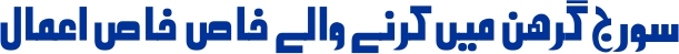 اہم بات : سورج گرھن میں جن اعمال کی زکوٰۃ نکالی جاتی ہے، وہ چاند گرھن میں نکالی گئی زکوٰۃ سے زیادہ طاقتور ہوتے ہیں۔ سورج گرھن میں ایسے اعمال کی زکوٰۃ نکالنے کی کوشش کی جائے جو خاص کر جادو اور جنات کے علاج اور دشمن کے خلاف استعمال ہوتے ہوں۔